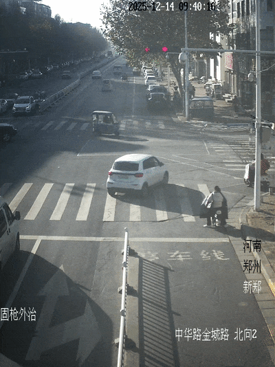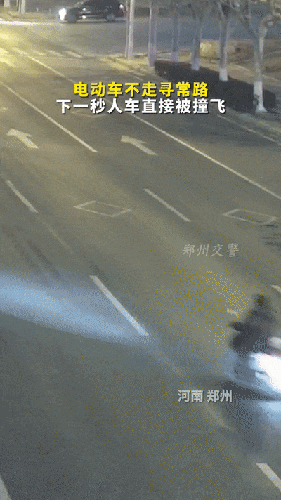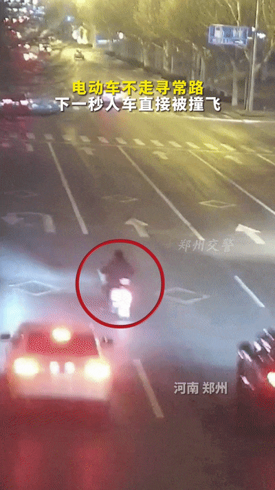 航空港区某路口,一辆电动车突然向左连续横跨三个机动车道试图超车,后方白色轿车刹车不及,与其发生碰撞。图一时之快,往往招致不可预料之险。
