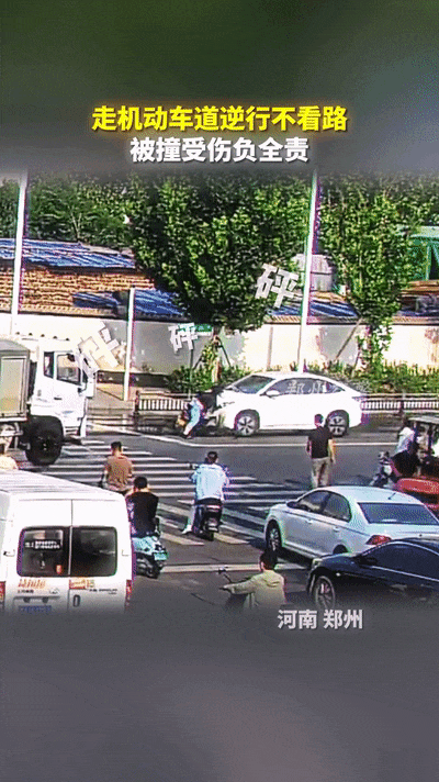 在郑州西四环与梧桐街交叉口,一男子率先闯红灯,当事人卢某见状也跟着通过。然而,“领头”者侥幸躲过,卢某却被侧向车辆撞倒。