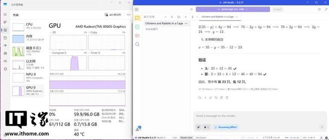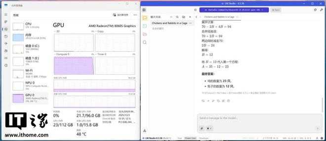在四款模型中,IT之家使用了同样的鸡兔同笼问题对其进行测试,在 8b 模型中,其推理速度可达 41.05 token/s,GPU 只满载了短短几秒。