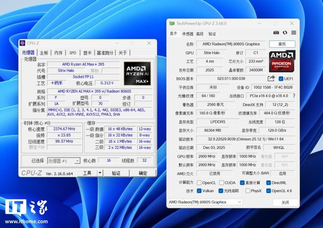 锐龙 AI Max+ 395 基于全新的 Zen 5 架构,采用领先的台积电 4nm FinFET 工艺制造,拥有 16 核心、32 线程的设计。其基础频率为 3.0GHz,最高加速频率可达 5.1GHz,并配备 80MB L2+L3 缓存。该芯片的 TDP 热设计功耗为 55W,并支持在 45W 至 120W 范围内进行配置,在性能和能效之间取得了良好平衡,这使其非常适合小型台式工作站使用,并且其规格已达到个人桌面级消费 PC 的顶级水平。