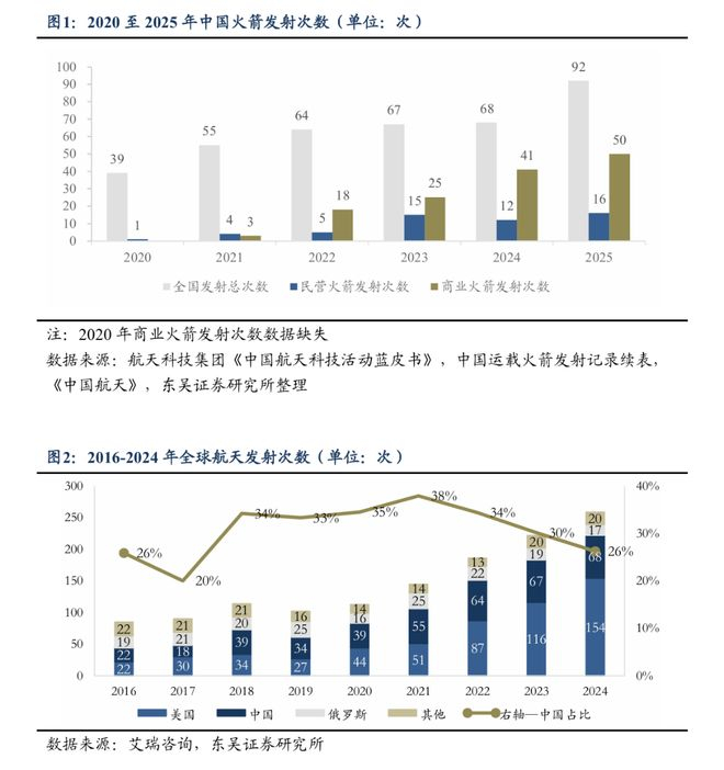 据东吴证券袁理团队22日发布的研报数据显示,中国火箭发射次数正经历快速增长,2025年中国火箭发射次数达92次,其中商业发射50次,较2020年的39次总发射量大幅增长。发射基础设施同步完善,中国现有工位总数21个,在建及规划5个,已构建起涵盖内陆、滨海及海上发射的立体化体系。商业发射占比提升,驱动行业更加聚焦发射经济性。
