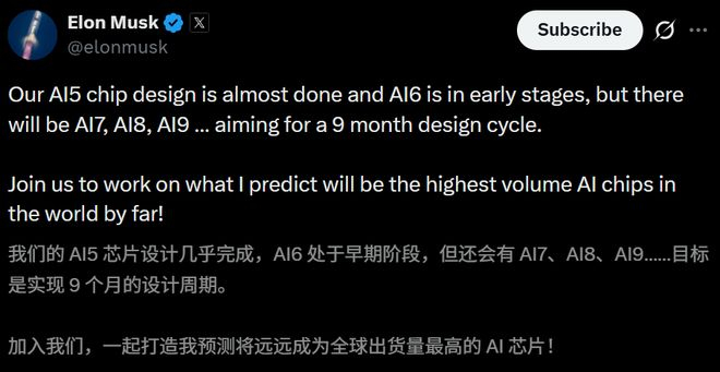 目前,AI5芯片设计快搞定了,AI6还处于早期阶段,后续的AI7、AI8、AI9.......蓝图也已铺开。