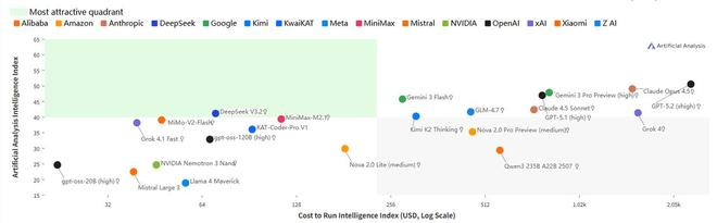 以DeepSeek、MiniMax为代表的中国开源大模型,每单位美元的智能化水平更高,比国外模型更有性价比。图片来源:Artificial Analysis