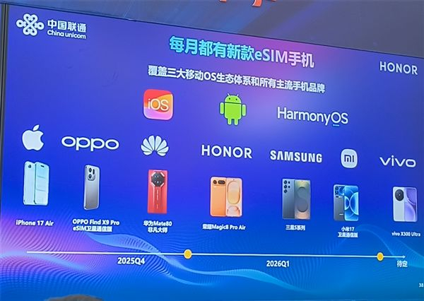 值得注意的是在,中国联通在现场公布的路线图显示,Q1还会有三星S系列、小米17卫星通信版作为eSIM新机上市。