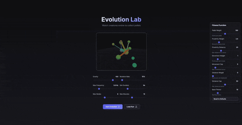 这个模拟器带有展示实时进化的交互式可视化界面,包含复杂的适应度函数、选择压力、变异率调节等高级功能。