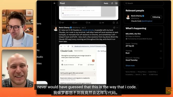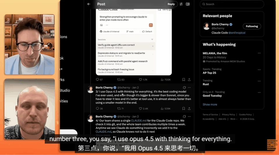 另外,今天的另一个重磅消息,是Claude Code之父Boris Cherny上了知名科技播客主持人Greg Isenberg的访谈节目。