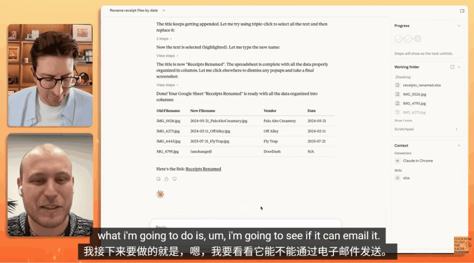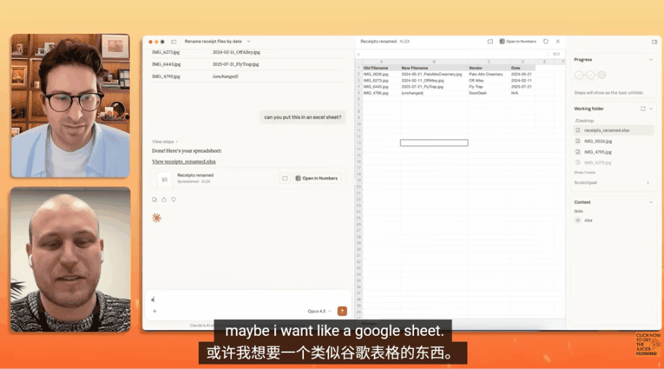 话不多说,Boris直接共享了屏幕,展示了Cowork的实战能力。