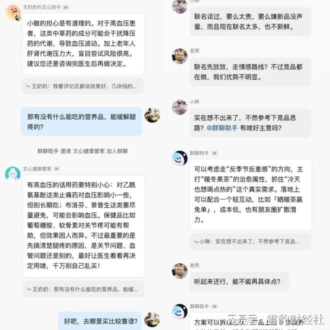 在最初的Beta版本中,用户只能@Agent进行问答。到目前内测的2.0版本中,Agent已经可以自主判断什么时候该回复,无需用户主动提及,同时新增了“文心健康管家”等垂类智能体,在识别到相关问题时由群聊助手自动拉进群。