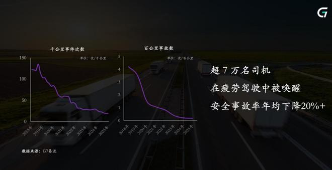 安全方面,自 2018 年推出安全服务以来,平台千公里高风险事件次数持续下降,百公里事故数不断趋近于零。过去数年,我们每年唤醒超 7 万名疲劳驾驶司机,帮助客户实现安全事故率年均下降 20%。