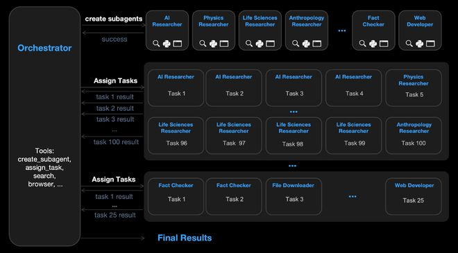 K2.5引入的Agent Swarm架构,让主模型具备了“摇人”的能力——面对复杂任务,Kimi会自动扮演“总指挥”,瞬间创建并调度数十个AI分身。
