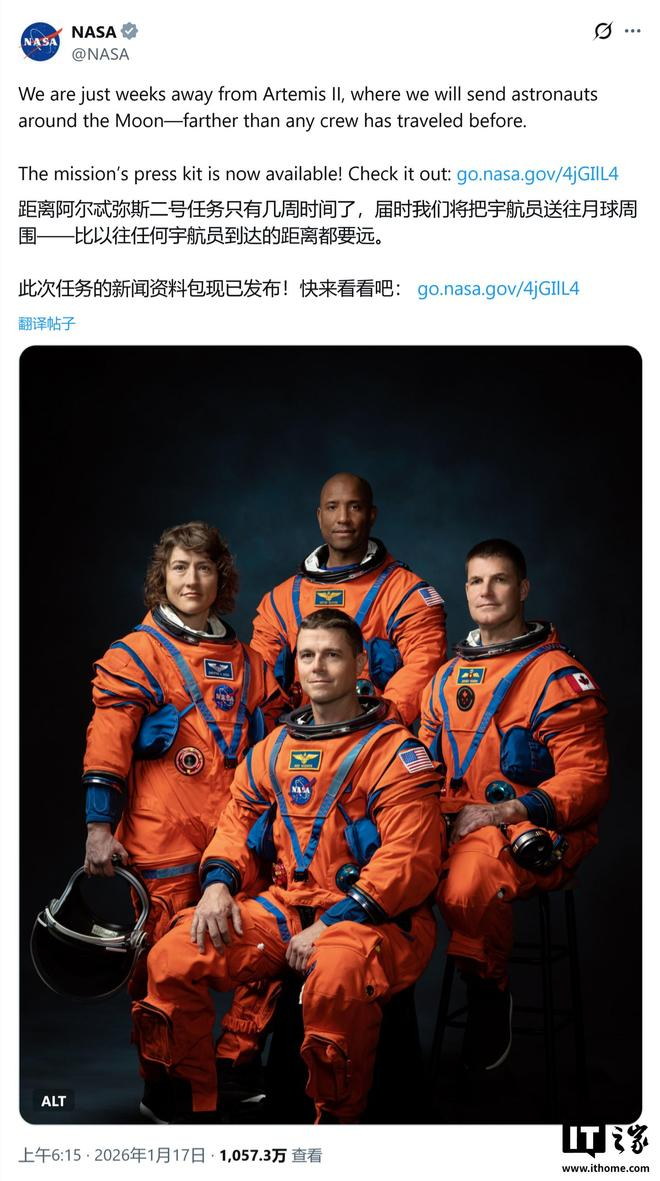 IT之家 1 月 29 日消息,Digital Trends 今日报道,随着美国国家航空航天局(NASA)阿尔忒弥斯 2 号任务进入最后准备阶段,四名机组宇航员已进入为期 14 天的隔离期,为首次载人绕月飞行任务 (预计最早于 2 月 6 日进行) 做最后准备。