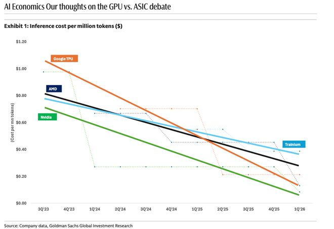 谷歌的TPU配合TensorFlow和Gemini,让其在AI算力成本上拥有了极高的护城河。高盛的研究指出,随着迭代,专用ASIC芯片的推理成本降幅远超通用GPU。