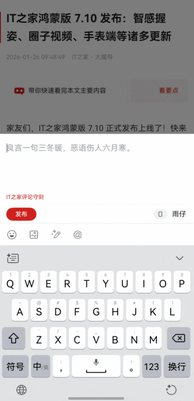 不仅能更舒适地刷IT之家,还能让畅所欲言更为方便,堪称单手操作的福音。