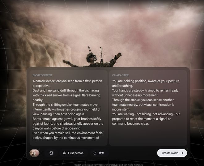 与视频生成模型不同,Project Genie有两个promtps填写位置,左边填写环境的 prompt,右边写主角的 prompt,还能上传参考图片。选择用第一人称还是第三人称。