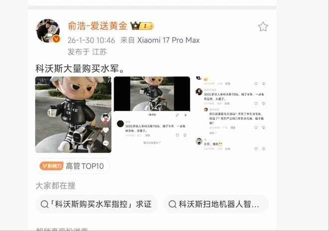 俞浩连发6条微博 称科沃斯大量购买水军抹黑追觅