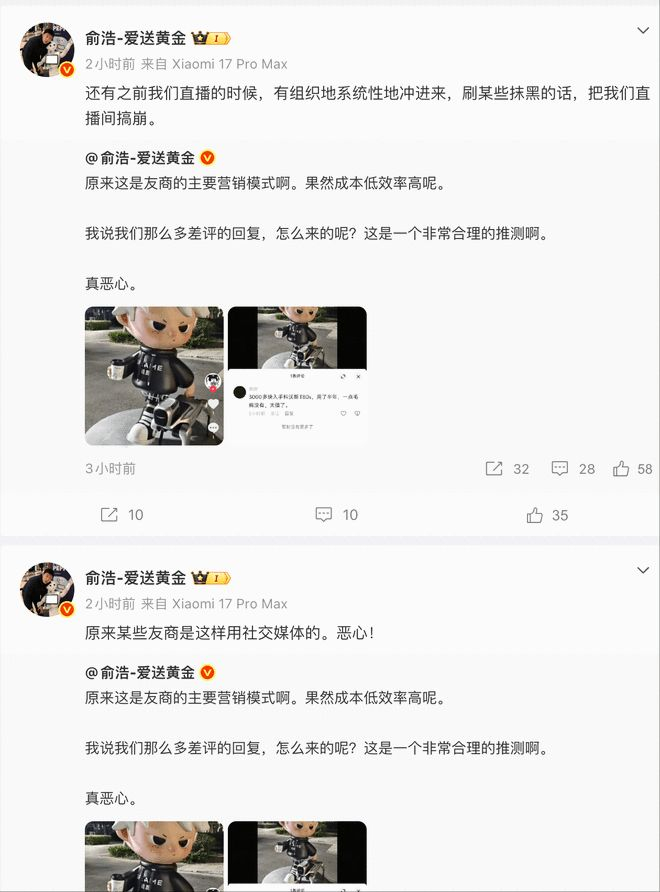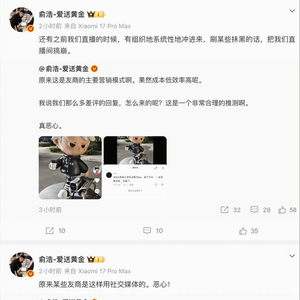 并由此转发了5/6条内容,称“科沃斯大量购买水军。 ”、“直播的时候,有组织地系统性地冲进来,刷某些抹黑的话,把我们直播间搞崩。”、“以前那么多黑子黑粉黑稿怎么来的?答案很明显。”