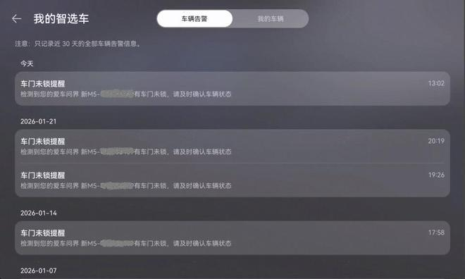 * 图片仅供参考,具体以实际车辆显示为准* 使用该功能需要在手机智慧生活 App 中创建好对应设备的场景* 车辆地理位置的条件也可和其它任务配合使用* 此次支持车型:新 M5 Ultra● 车家互联新增车家告警消息互通华为智能家居与车机互联,支持车机告警消息可在家中智慧屏查看,家中告警消息支持在车机中控屏查看功能打开路径 / 使用方法:打开手机智慧生活 App > 我的 > 连接三方平台 > 智选车 > 鸿蒙智行 / AITO 进行账号绑定,绑定成功后可前往家里智慧屏查看车辆告警信息。账号绑定成功后,当家里水浸、燃气、康养传感器产生告警信息可在车机中控屏查看,当车机产生告警消息可在家里智慧屏查看