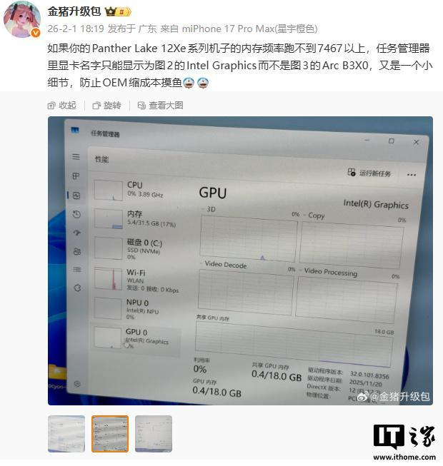 根据微博博主 @金猪升级包 验证,锐炫 B390 和 B370 对内存配置存在明确的技术要求:若设备内存频率未达到 7467MHz 以上,系统任务管理器中将无法正确识别显卡型号,仅显示为“Intel Graphics”。他认为这是英特尔为防止 OEM 厂商通过降低内存规格压缩成本的限制策略。