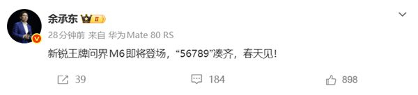 快科技2月2日消息,华为常务董事、终端BG董事长余承东今日发文宣布:新锐王牌问界M6即将登场,"56789"凑齐,春天见!
