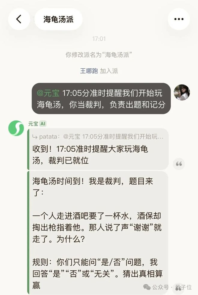以往玩海龟汤,最痛苦的不是猜不出来,是没人愿意当那个主持大局的裁判。但在元宝派里,这活儿直接甩给元宝就行。