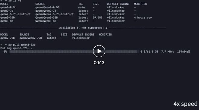 得益于底层的极致优化,在执行xw start启动实例时,系统能够自动调配 vLLM 等高性能后端。实测数据表明:即便是 32b 规模的模型,玄武 CLI 也能在 30 秒内完成启动。这个时间内,系统会自动完成模型切分、显存加载,并成功启动推理引擎。