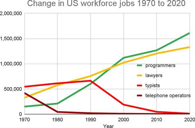 但现实恰恰相反,2020年美国的程序员数量是1970年的11倍。