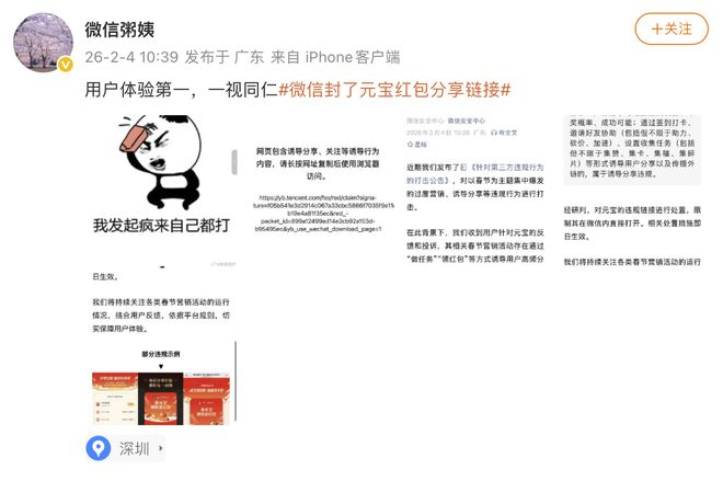 2月4日,微信公关总监@微信粥姨 发文回应微信屏蔽元宝红包分享链接:用户体验第一,一视同仁。