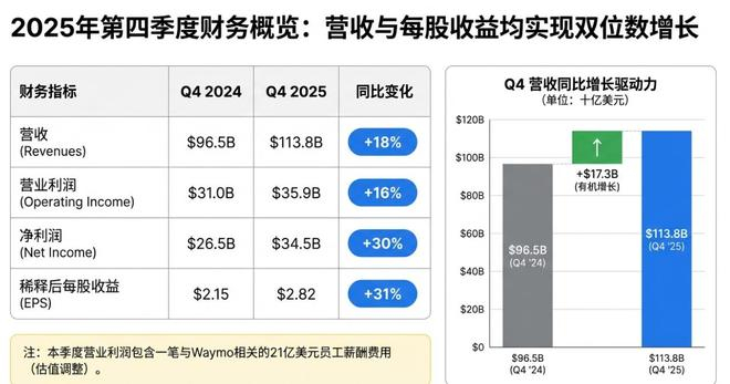 财报显示,Alphabet第四季度营收同比增长18%至1138亿美元,继三季度首次营收破千亿后再创单季历史新高,较分析师预期的1114亿美元高逾2%。每股收益(EPS)为2.82美元,保持30%以上的同比增速,较分析师预期的2.65美元高逾6%。