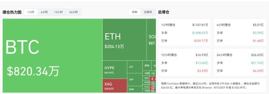 CoinGlass数据显示,最近24小时,加密货币市场共有579506人爆仓,爆仓总金额为26.03亿美元。其中多单21.74亿美元,空单4.29亿美元。