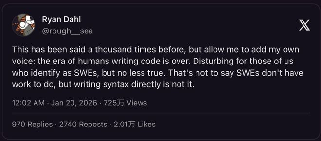 其影响力已深入顶尖技术从业者群体。一年前创造了“氛围编程”一词的OpenAI前科学家Andrej Karpathy坦言,长期使用AI编码已导致其手动编程能力逐步退化。Vercel首席技术官Malte Ubl称其核心工作转变为“纠正AI错误”,NodeJS创始人Ryan Dahl更直言“人类手写代码时代已结束”。工具创建者Boris Cherny透露,团队近100%代码由Claude Code结合Opus 4.5完成,Linux创始人Linus Torvalds亦成为此类工具的活跃使用者。