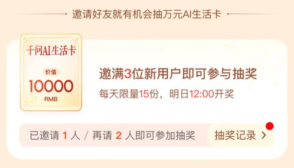 如果成功邀请了3位新朋友后,还能抽取价值万元的千问AI生活卡。