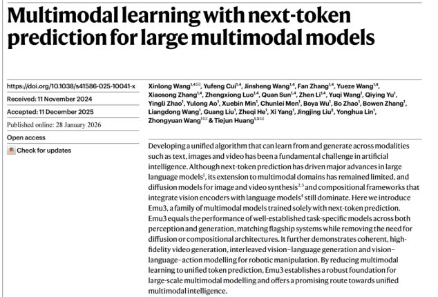 几天前,《Nature》杂志刊发了一篇来自中国的人工智能研究论文。这在顶级学术期刊上并非新鲜事,但这篇论文的分量却非同寻常:它来自北京智源人工智能研究院,核心成果是一个名为“Emu3”的多模态大模型,而它试图回答的问题,是整个AI领域过去五年来悬而未决的核心命题——我们能否用一种统一的方式,让机器同时学会看、听、说、写,乃至行动?
