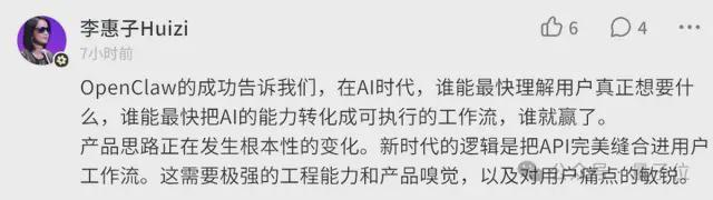 她指出,OpenClaw代表的是新AI时代的一种产品思路,这条赛道不比模型,重点在于谁能更快地把API真正用户的工作流。