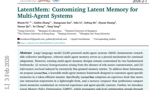 人工智能领域的多智能体系统正在经历一场记忆革命。由上海AI实验室、同济大学、新加坡国立大学、香港中文大学、南京大学和上海交通大学组成的国际研究团队,在2026年发表了一项突破性研究成果——LatentMem框架。这项研究发表在arXiv预印本平台上,论文编号为arXiv:2602.03036v1,为多智能体系统的记忆设计带来了全新思路。有兴趣深入了解的读者可以通过该论文编号查询完整论文。