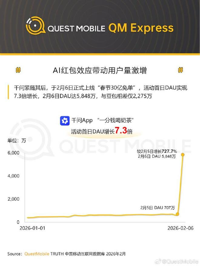 2月10日,QuestMobile发布最新数据,在新春活动启动首日(2月6日),千问App的日活跃用户(DAU)实现了727.7%的增长,达到5848万,比前一天多出超5100万。