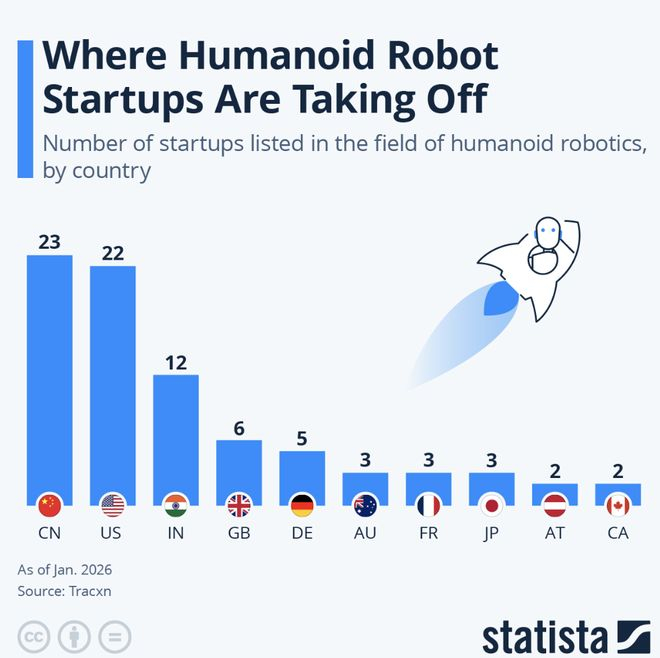 Statista的统计显示,中国以23家人形机器人相关初创公司位居首位,美国紧随其后为22家。