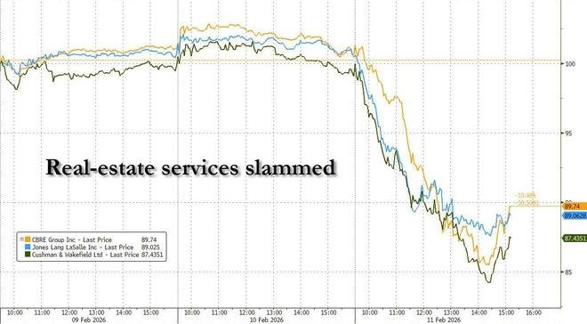 行情数据显示,随着业内对AI应用带来行业颠覆的恐惧进一步蔓延,两周来美股市场上的第四个“受害者”也正随之出现——周三,多只地产服务股纷纷大幅下挫,投资者开始评估这些公司面临最新人工智能应用和工具冲击的脆弱性。