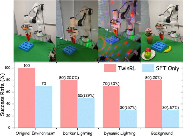 图 x:鲁棒性分析。我们在此前未见过的环境扰动条件下,对 SFT 策略与 TwinRL 引导的在线 RL 策略进行对比;上排展示了扰动场景示例。