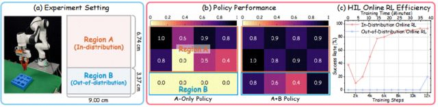 图 2:探索瓶颈。(a) 我们将工作空间划分为分布内区域(A)与分布外区域(B)。每个区域由任务完成时被操作物体中心的位置进行定义。(b) 热力图可视化展示了不同策略在各区域中的性能表现。(c) 学习曲线展示了 A-only 策略在两个区域中进行在线强化学习时的训练动态变化。