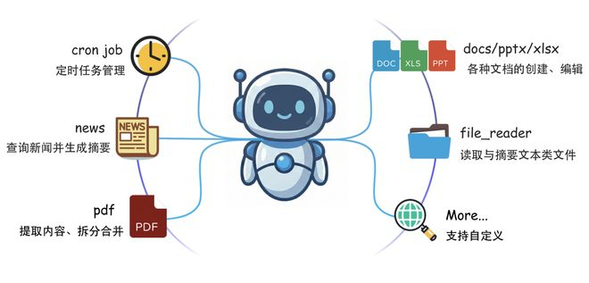 CoPaw 通过 Skills 扩展 Agent 的能力:内置多类开箱即用能力(cron、file_reader、pdf、docx、pptx、xlsx、news 等),支持在工作目录下添加自定义 Skill,或通过控制台进行 Skill 的启用 / 禁用、编辑等操作。