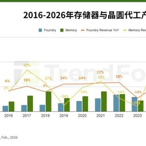 2月14日,TrendForce集邦咨询最新数据显示,受惠于AI浪潮的推升,存储器与晶圆代工产值均将在2026年同步创下新高。存储器产业受供给吃紧与价格飙升影响,产值规模大幅扩张至5,516亿美元。尽管晶圆代工产值同步创下2,187亿美元的新高纪录,但存储器产值规模已攀升至晶圆代工的2倍以上。