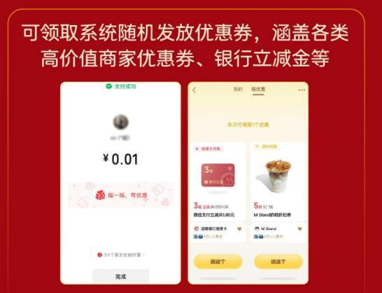 以微信支付为例,活动期间,用户在完成支付后,支付结果页将有机会出现“摇一摇有优惠”活动展示。用户参与互动后,可根据页面提示在系统随机发放的优惠中实现“二选一”领取,涵盖各类高价值商家优惠券及银行立减金等优惠。领取后可通过微信支付服务号实时查看及核销。