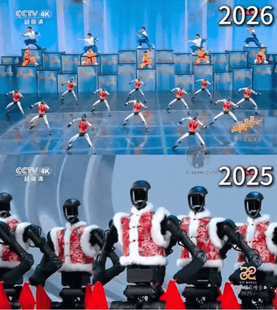 如果说,2025年16台机器人扭秧歌已经足够出圈,那么2026年的春晚,则彻底完成了从「病毒式传播」到「系统级能力展示」的升级——机器人们跑步、3米空翻、单腿后空翻、复杂队列协同,技术含量肉眼可见。