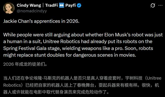 但到了26年,画风就完全不一样了。这帮机器人腾空而起,每个后空翻都干净利落。转身,收拳,起势,一套动作行云流水,简直进化成了少林寺武僧。