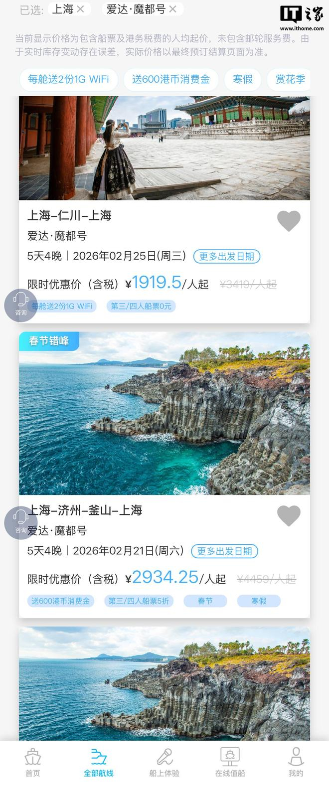 IT之家查询爱达・魔都号预订微信小程序,其中显示 2 月 25 日出发“上海-仁川-上海”5 天 4 晚的行程定价为 1919.5 元 / 人、2 月 21 日出发“上海-济州-釜山-上海”5 天 4 晚的行程定价为 2934.25 元 / 人。
