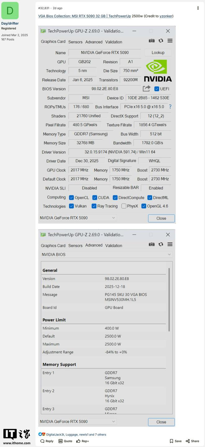IT之家 2 月 18 日消息,科技媒体 Wccftech 于 2 月 16 日发布博文,报道称在 800W 和 1000W 版本后,适用于微星 RTX 5090 Lightning Z 显卡的 2500W XOC BIOS 文件近日在网络上流出。