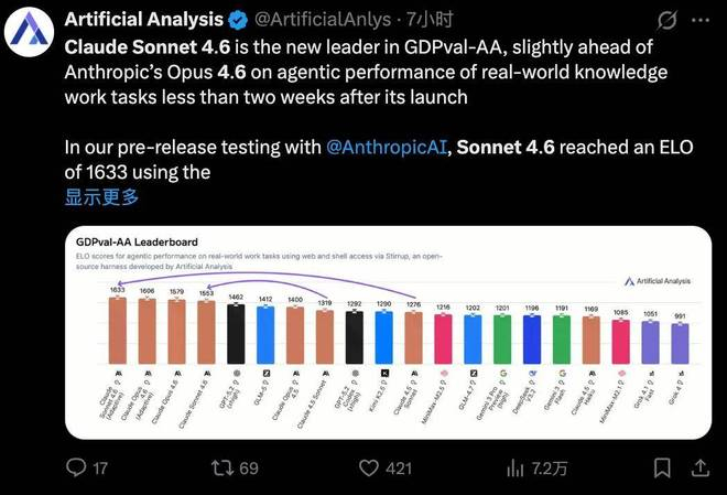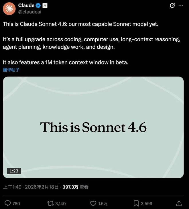 Claude最强Sonnet模型4.6来了,百万token上下文