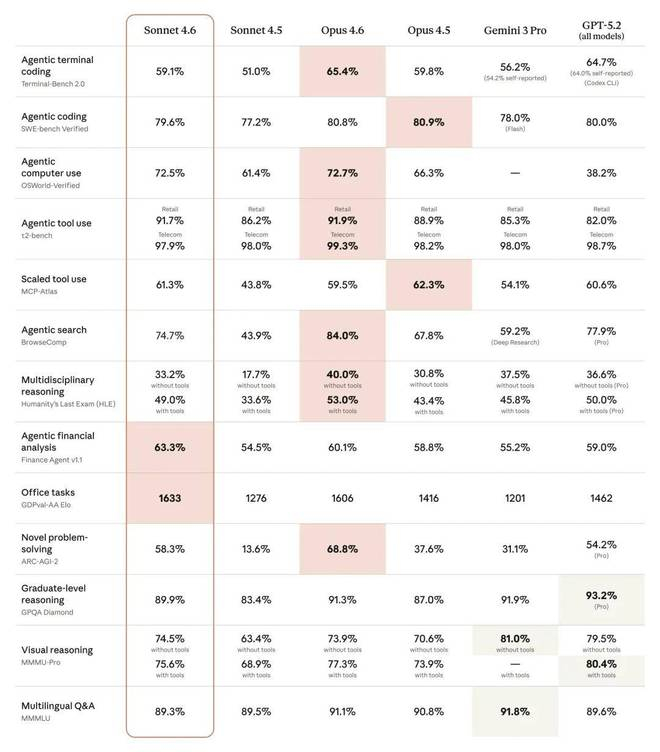 除了计算机使用,Claude Sonnet 4.6 在各项基准测试中均有提升。它的智能水平接近 Opus 级别,但价格更实惠,使其适用于更广泛的任务。