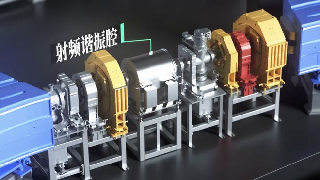 在圆环的特定位置设置有 “ 射频谐振腔 ”,它的功能是形成非常高频的交变电场。电场内的电磁波会像海浪一样,不断推动碳离子加速。但只加速一次肯定是不够的,所以射频谐振腔会不断改变电场的大小和方向。