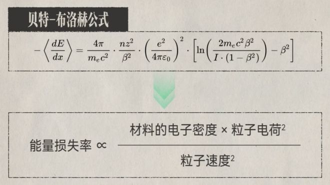 想要在微观世界中描述粒子速度和能量释放的关系,我们可以通过贝特-布洛赫公式来表示。可以看出来,粒子的速度和能量损失是成反比的,也就是说碳离子的速度越慢,它的能量释放就越大,所以当它最后停下来的时候,能量会瞬间全部释放。